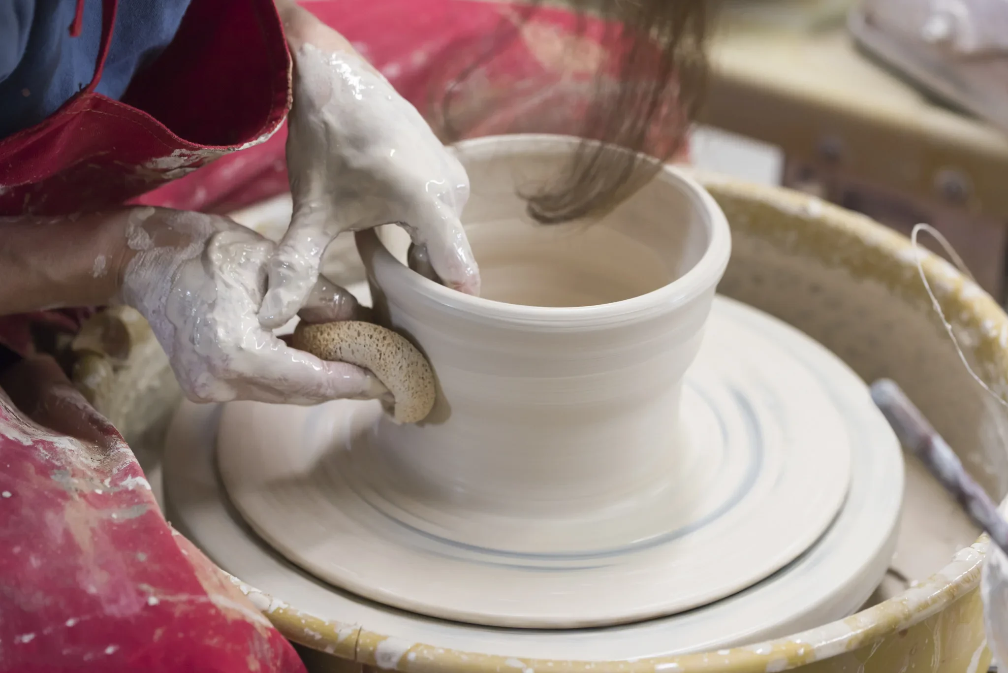 The course includes wedging, centering clay, throwing basic bowl and cylinder forms, trimming, finishing, and glazing.
